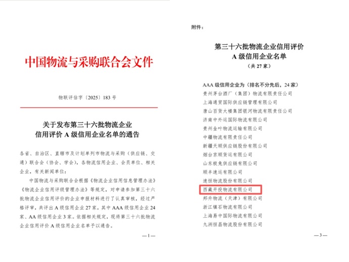 近日,中國(guó)物流與采購(gòu)聯(lián)合會(huì)公布了第三十六批物流企業(yè)信用評(píng)價(jià)A級(jí)信用企業(yè)名單,西藏開(kāi)投物流有限公司獲評(píng)“AAA級(jí)信用企業(yè)”。