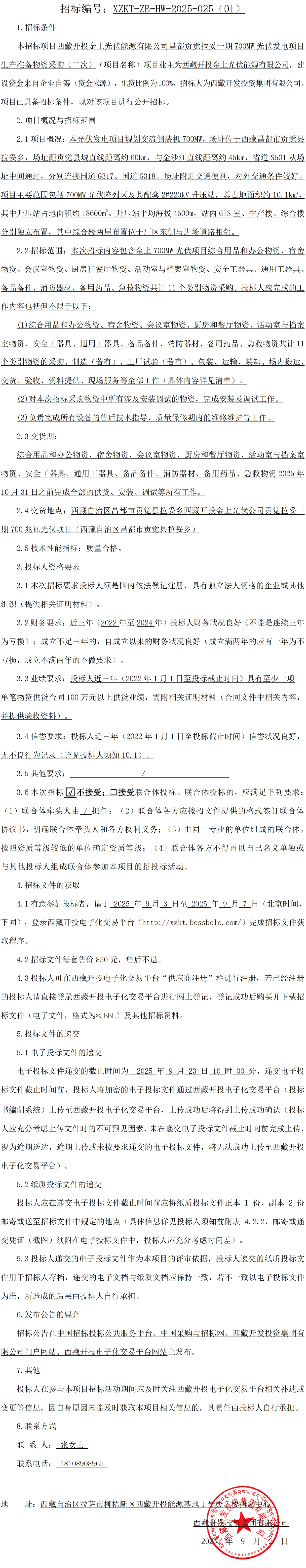 西藏開投金上光伏能源有限公司昌都貢覺拉妥一期 700MW 光伏發(fā)電項目生產準備物資采購(二次)招標公告